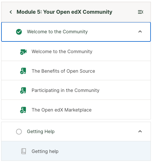 Similar to a completed the subsection, the icon next to the section name updates to a checkmark icon once the learner has completed all subsections in the section.