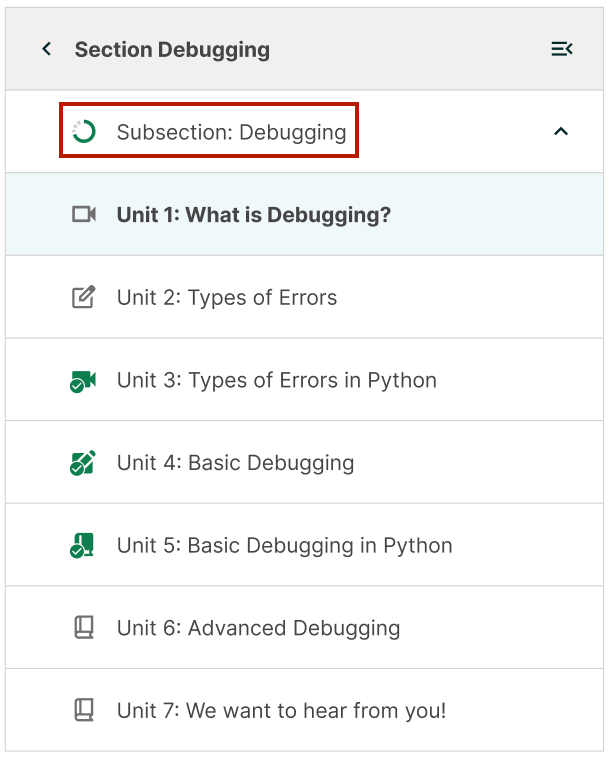 In addition to completions, in-progress work is indicated on the sidebar navigation for course sections and subsections. Once a unit is completed in a section or subsection, the icon next to the section or subsection name is updated to reflect the rough amount completed.
