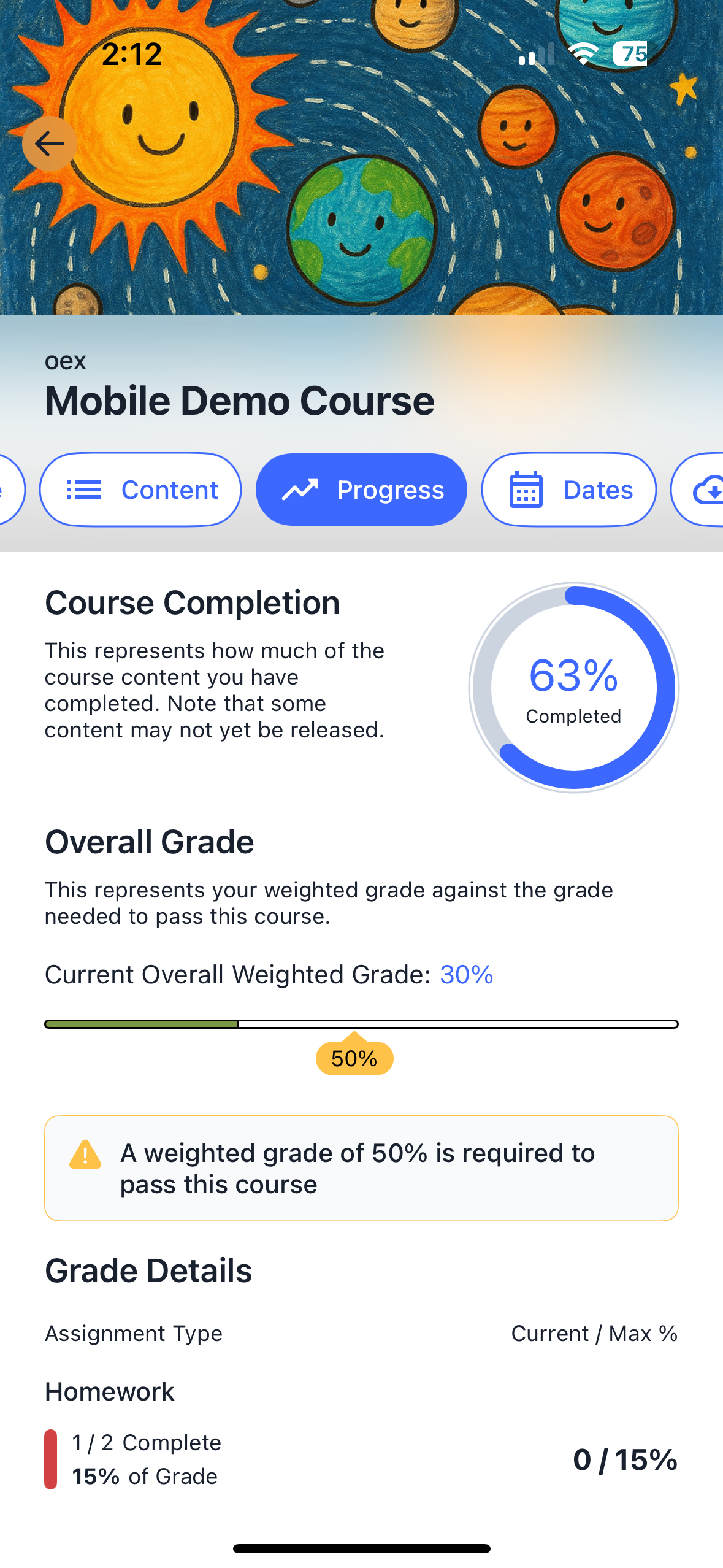 Total progress towards a passing grade and progress through all assignment types |