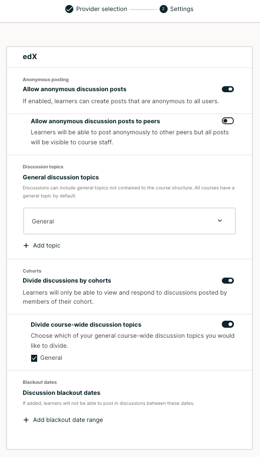 Navigate to Open edX discussion provider configuration page (see Configure Open edX Discussions).