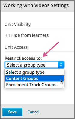 If you have more than one enrollment track in your course, or if you have enabled cohorts, you can limit a unit’s availability to specific groups of learners. For information about offering different content to different learner groups, see Offering Different Content to Different Learner Groups.