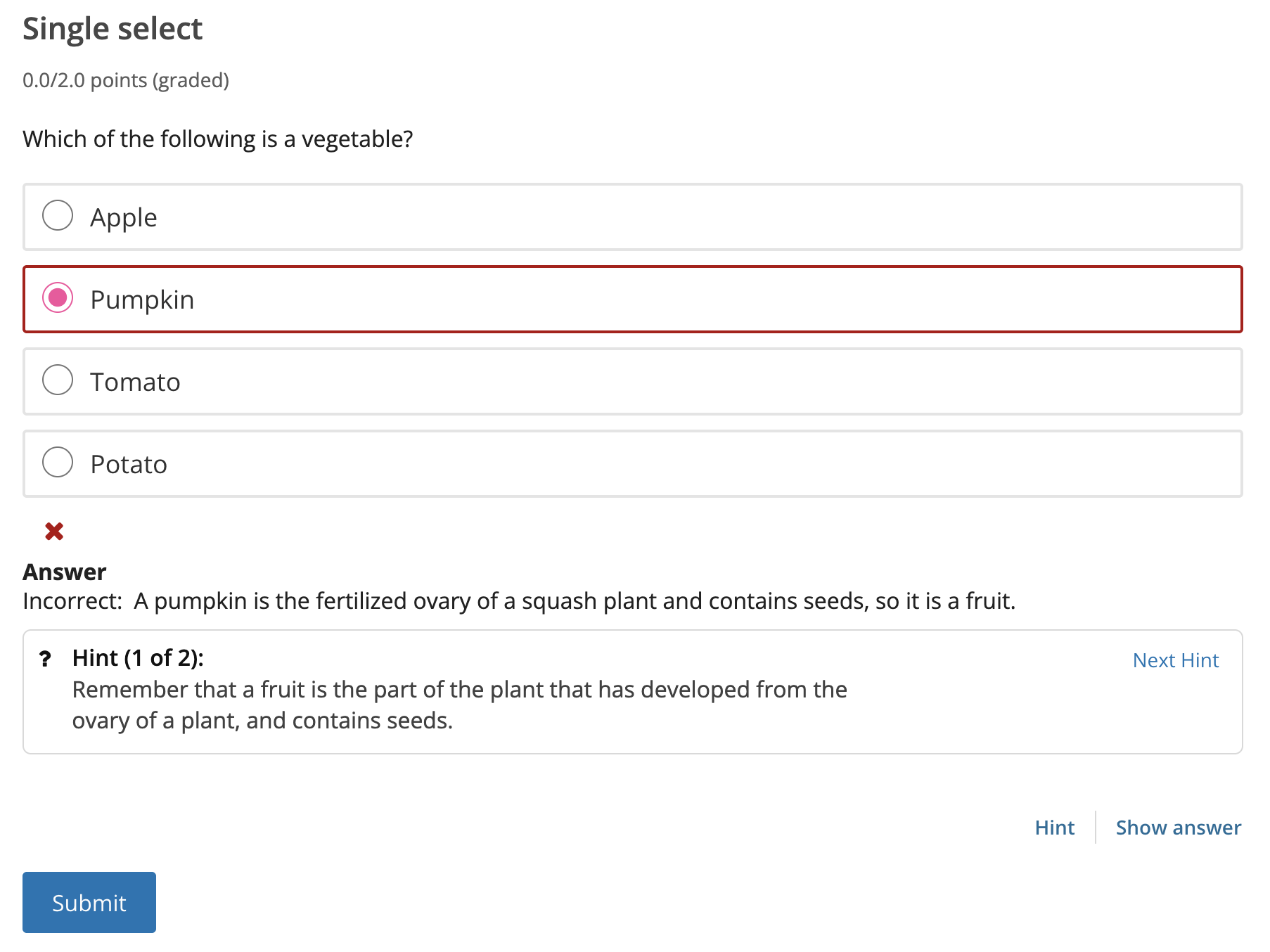 For example, the following single select problem provides feedback in response to the selected option when the learner selects Submit. In this case, feedback is given for an incorrect answer.