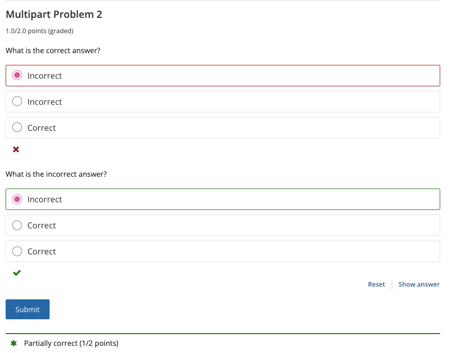 The LMS will distribute the total number of points available for the problem evenly across all problems. So in the following screenshot, with a two-part problem worth 2 points, if a learner answers one part correctly and the second incorrectly, they will be awarded 1/2 points.