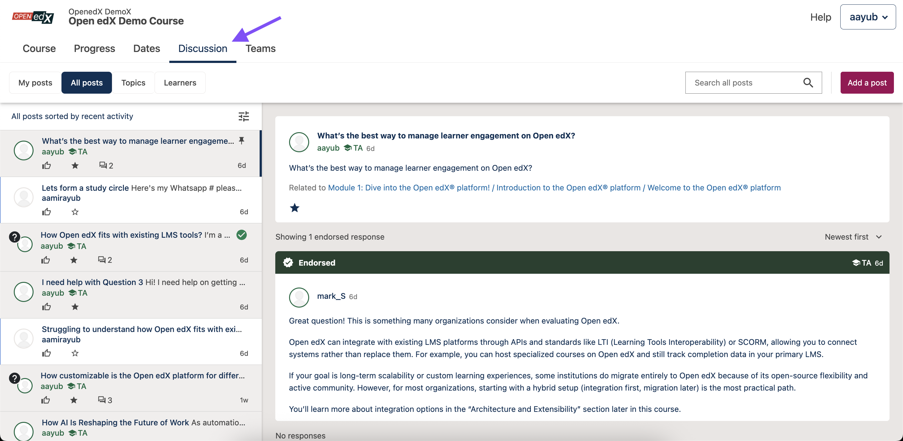 Response: Other learners or course staff can write responses to a post. Responses add explanations, share experiences, or suggest solutions. They sit directly under the original post.